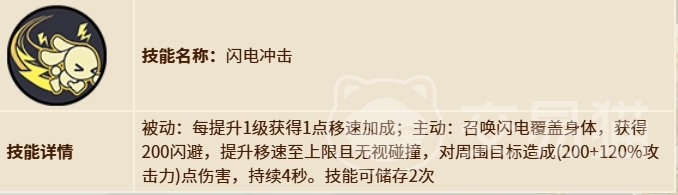 主动效果在激活技能时,兔耳游侠能够召唤出强大的雷电力量环绕自身,瞬间获得200点闪避值,提高了自己生存能力,同时其移动速度会被提升至当前所能达到的最大值,并且在这个过程中不会受到任何碰撞的影响,此外该技能还会对周围一定范围内的所有敌方单位造成一定的输出,持续时间长达4秒钟之久,值得注意的是,这项强大的能力是可以被存储两次使用的,意味着玩家可以根据实际情况灵活选择释放时机以最大化利用其优势。