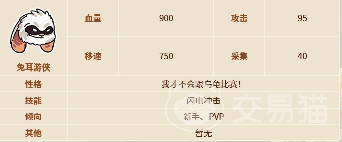在基础的属性上面兔耳游侠有血量900,攻击95的数值,而移动速度达到惊人的 750,采集能力也相当不错,有40的数值,技能方面它拥有强大的闪电冲击能力,能够迅速提升自己的移动速度并无视碰撞,对周围目标造成大量伤害,所以在倾向上,它更适合新手玩家和喜欢 PVP 的玩家,而被动效果是随着角色等级的提升,每升一级将增加1点移动速度加成。