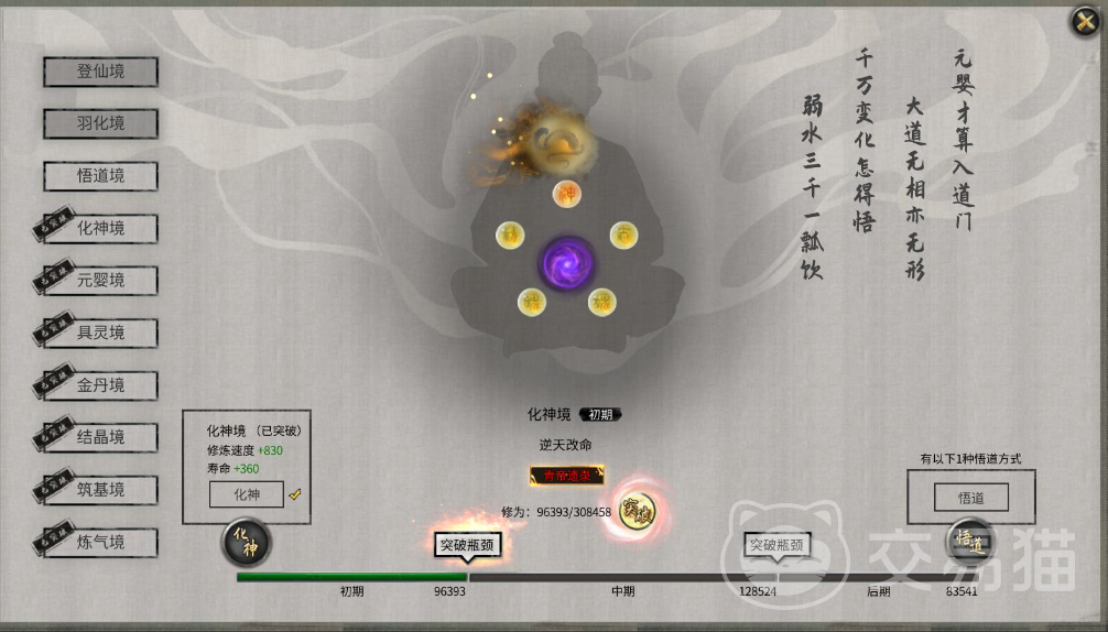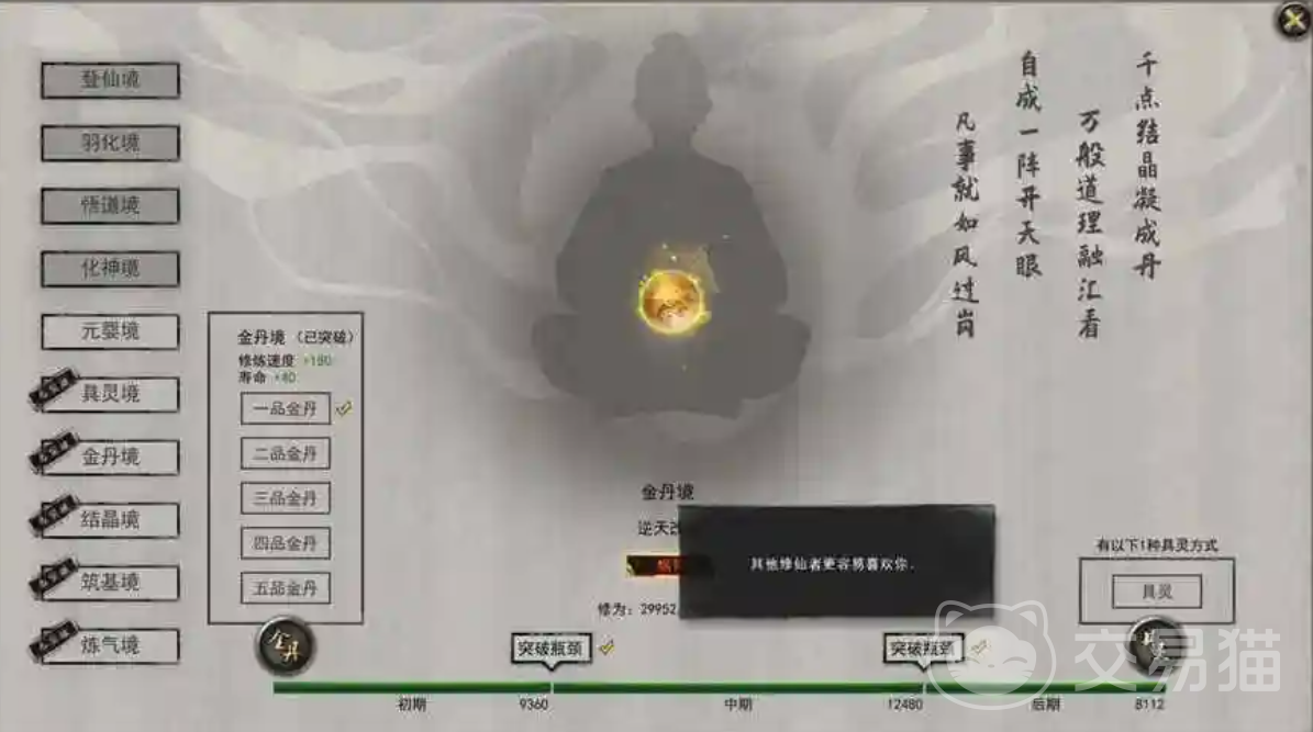 游戏中的修炼境界一共划分为10个等级,从低到高分别为炼气、筑基、结晶、金丹、聚灵、元婴、化神、悟道、羽化、登仙。而这10个等级中又有着细微的划分,每一境界都分为三个小境界,分别为前期、中期和后期,因此玩家们在游戏中一共有30个境界可以突破,不过当前游戏版本中还并未更新羽化和登仙这两个境界,所以小伙伴们最多只能到悟道后期。