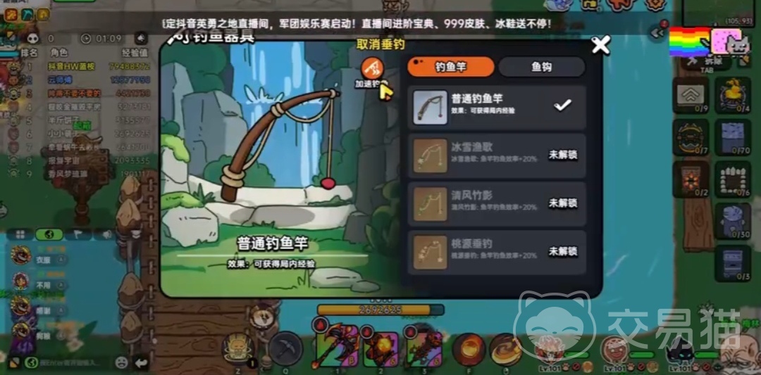 如果玩家们想要获得鱼竿,可以立马点击图标,让自己进入到钓鱼的状态,游戏中的鱼竿也分为不同的款式,他们获得方式都是不同,现在只能通过最低的进阶版英勇宝典,获得的这些鱼竿。