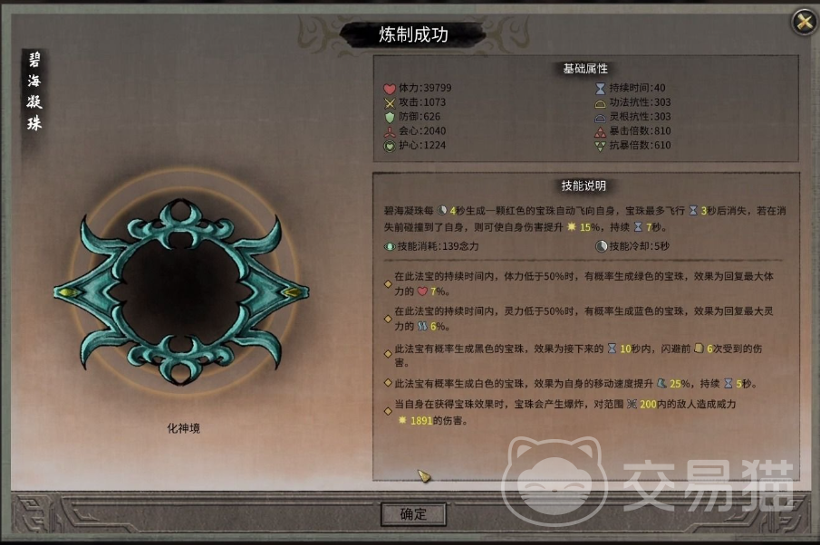 第1个为玩家们推荐的是碧海凝珠,碧海凝珠在施展之后,每隔4秒将会生成一颗红色的宝珠,这颗宝珠将会飞向自身,并且在三秒之后消失,如果宝珠存在期间,玩家们自身碰到了宝珠,那么伤害将会在7秒之内提升15%。如果生成的是黑色宝珠,那么玩家们撞击到宝珠之后,可以闪避接下来的几次伤害。宝珠在炼制成功之后,将会有5个词条,除了上文中的两颗宝珠之外,还将附带许多额外效果。