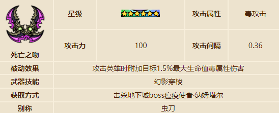 现在这是一把六星级的武器,带有毒属性伤害。并且攻击力高达100级,攻击敌方英雄时可以附加1.5%的最大生命伤害,可以用来杀一些高血量的对手或者boss的话,可以更快破防并将其击败。