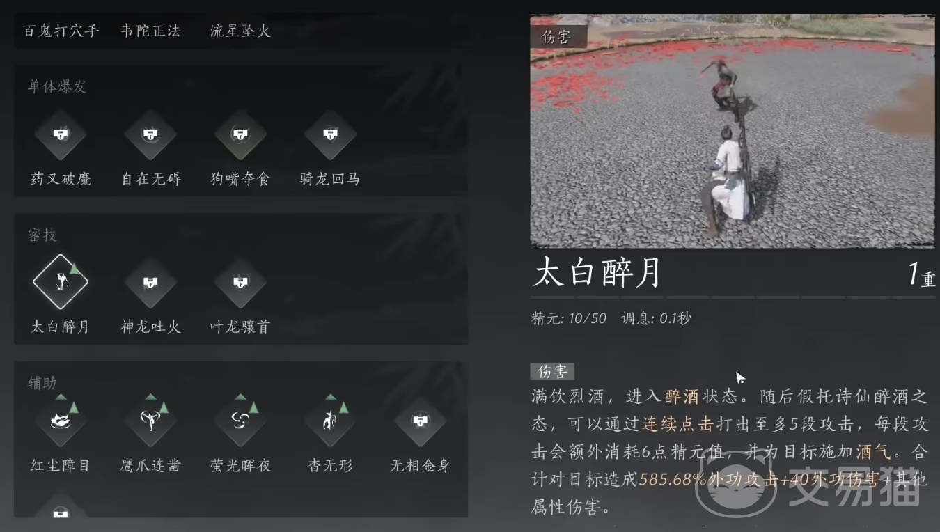 此外,在其它地方的美酒商人那买酒并喝掉一样有效,并不限定只在丰禾村美酒商人处才能学习。在使用时只要玩家饮满烈酒进入醉酒状态,就可打出至多五段的攻击,并对命中的敌人造成伤害。该伤害的最终值由玩家的外功、内功和其它属性伤害共同决定。