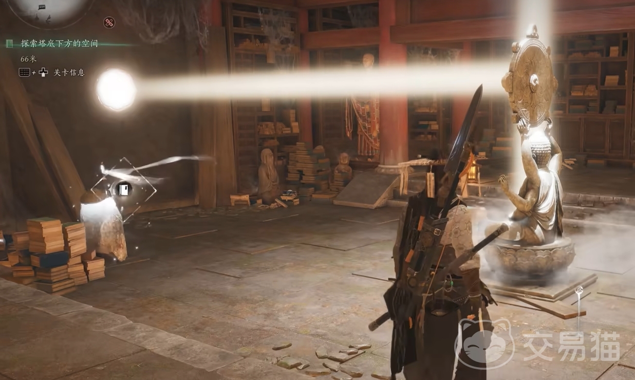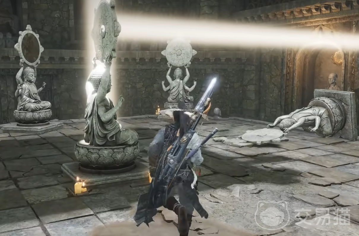 进入该解密房间后,玩家可先站在中间佛像处,并以光线初始所照射的方向为基点,通过点穴转动中间的佛像,将光线的方向转至基点后方的佛像处,再转动后方的佛像使光线射向基点右后方的佛像,接着继续转动基点右后方佛像让光线照到基点右前方的佛像处,并调整该佛像的方向,令光线能照到基点左上方的佛像(机关所在处),最后调整基点左上方佛像的角度,就能打开机关。