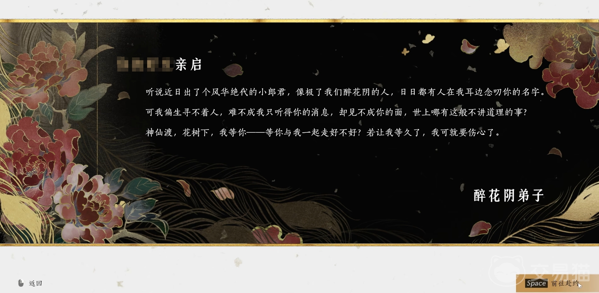 在游戏中人们只需换一套风华高的服装,就能获得醉花阴弟子寄过来的邀请函,是目前最容易触发的加入醉花阴的方法。拿到邀请函后各位可按指引来到见面的弟子,并在醉花阴弟子和梨园弟子中选择前者,就能完成加入醉花阴的任务了。