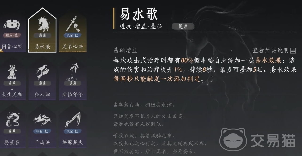 可在释放处决技时为自己回复血量的心法,在打据点时很好用。该心法只要玩家通过了镇守剧情春秋别馆,就能在打败小十七后将它给拿到手。
