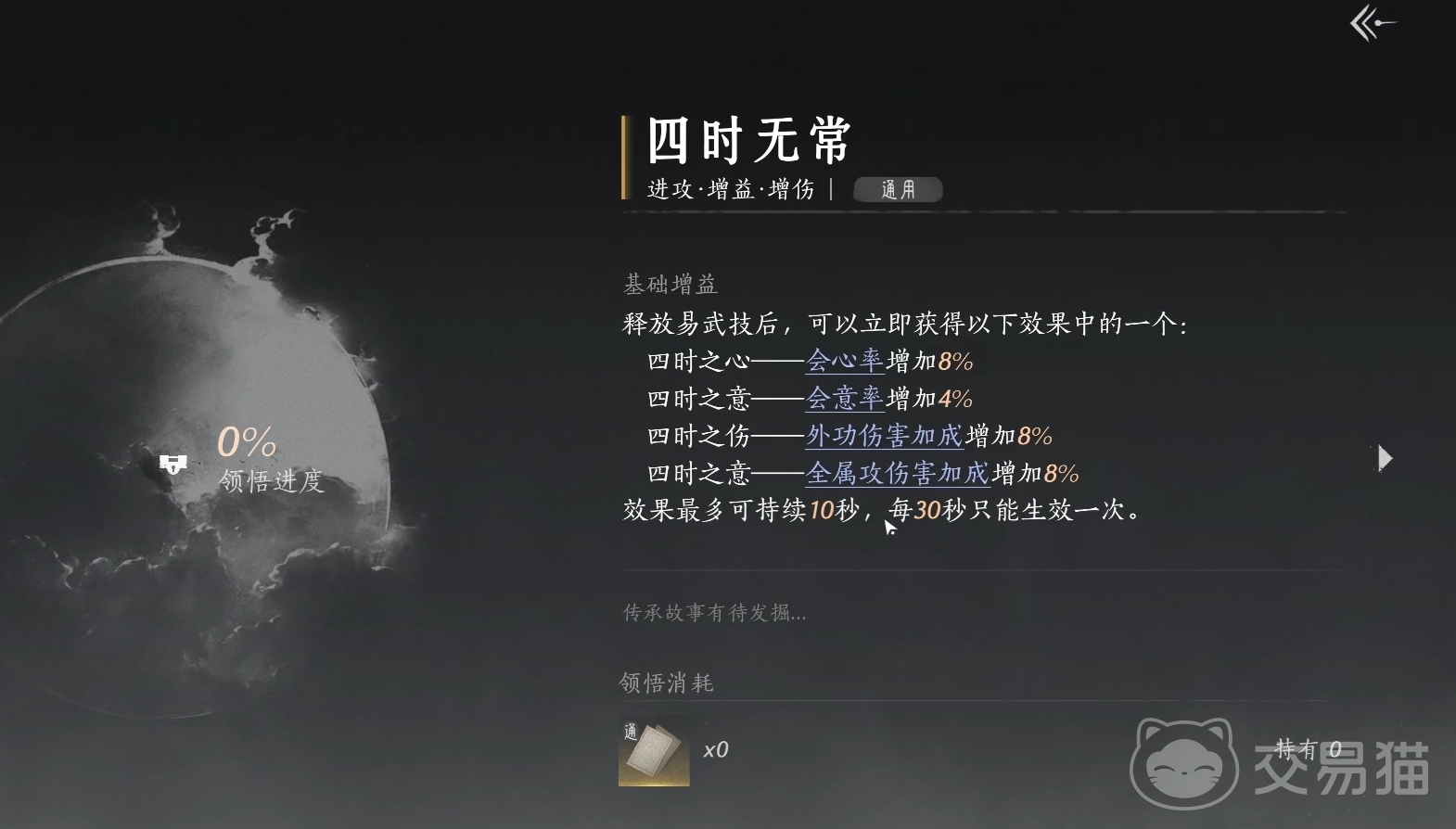 释放易武技后可获得四种效果其一,分别为会心率加20%,会意率加10%,外功伤害加20%,全属性伤害加20%,是比较拼运气的一种心法,可在大相国寺的曹生书画铺找曹生购买。