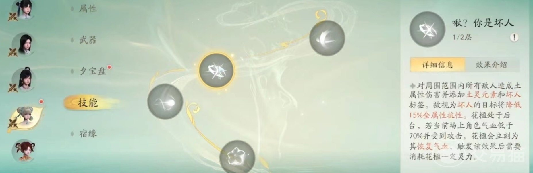 除了进场技能,花楹还有两主动技能,分别是攻击技能和治疗技能,一技能是一个上场有着不俗的攻击,下场还可以给队友提供治疗的技能,在场上时,花楹会移动对敌人进行标注,只要被标注上的敌人,敌人自身的抗性就会直降15%,还会迎来花楹土属性的狂轰滥炸,在后台的时候,花楹也不休息,她就会给队友提供治疗,若是队友的血量已经不足70%时,花楹就会紧急给队友恢复气血。
