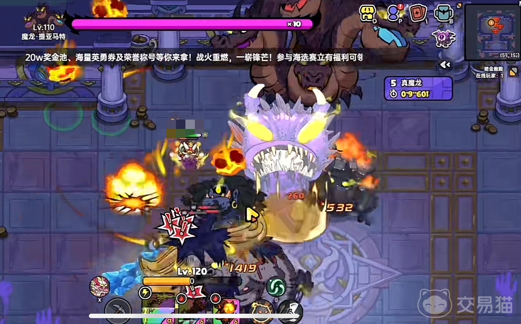 最后一个头攻击方式就是从左往右吐出毒雾,千万不能忽略在雾里面的伤害,一定要跟随着毒雾的轨迹慢慢的向右移动,每个技能结束之后最好向中间站,这样无论下一波魔龙发出什么技能都可以有效的做出针对性的躲避。每次释放技能,魔龙的头会有着明显的前摇,推荐大家选择吸血鬼或者是木乃伊两个职业,前者可以在攻击的时候获得更高的续航,而后者则是自己在躲避技能的时候也能召唤蛊物持续造成伤害。