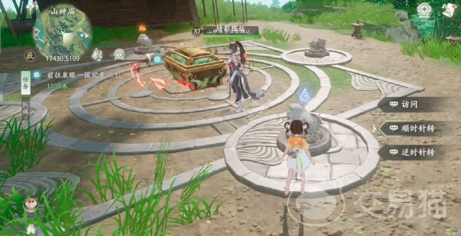 第四个石像的位置(17429,5101),这里石像的解锁方式是将石蟾的嘴都对向中间的图案、具体的操作:先转动水属性的石像,再转动土属性的石像,接着是风属性的石像,这样操作就能成功解锁中间的石像,成功拿到第四个宝箱。