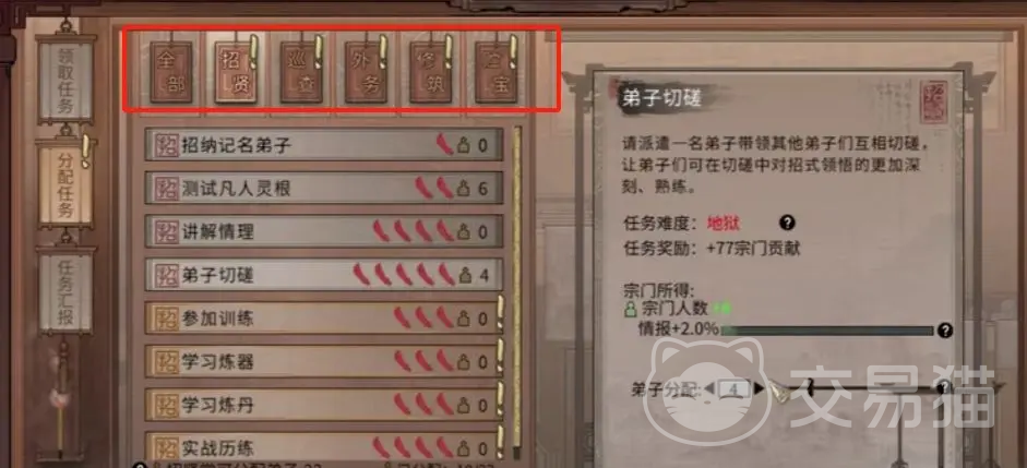 成为宗门门主后,先将调度权限关闭,这样宗门就不会自动随便调度,打乱自己的节奏了。其次就是将宗门里的所有人都拉到招贤堂,然后分配测试凡人灵根任务,过数月之后,宗门人数就会不断上升了。