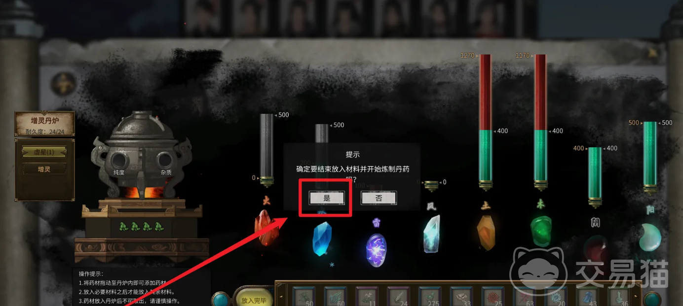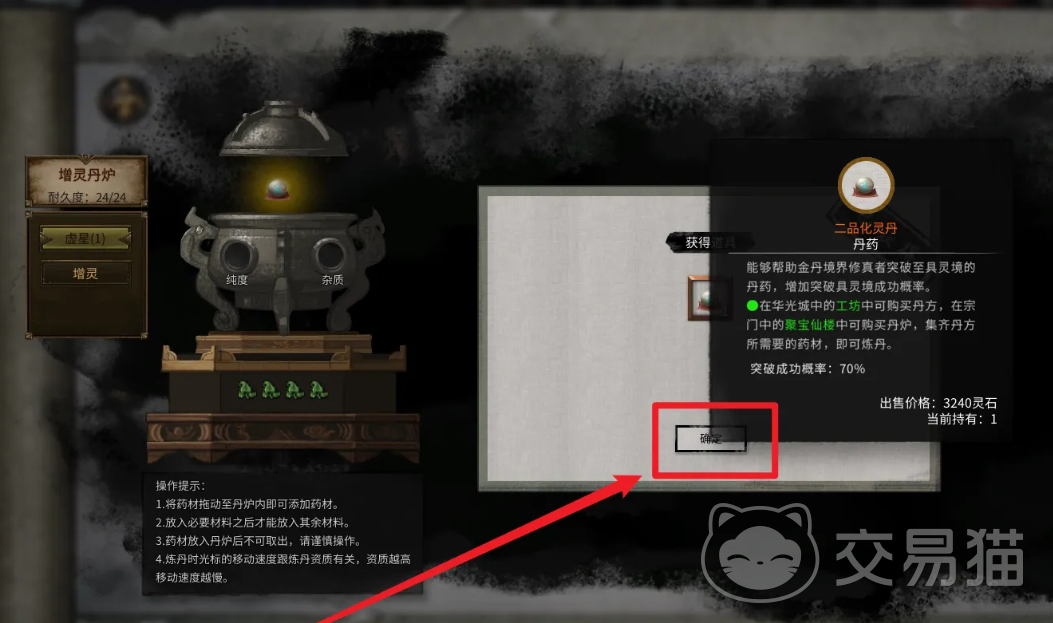 在这个界面里,将之前准备好的材料放入到丹炉中,记得数量一定要严格按照丹方的要求来放置,不然可能会影响到炼制的结果,材料放置好后,点击确定炼丹就能顺利得到化灵丹了。