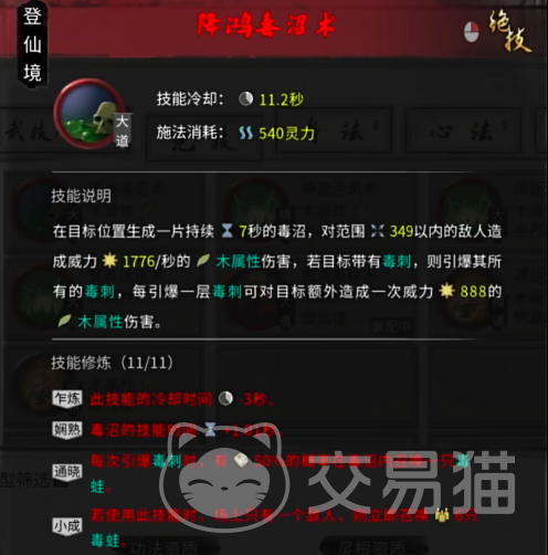 绝技使用毒沼术,必要词条选择技能冷却减少,技能持续时间延长,每次引爆毒刺有几率生成毒蛙,在技能使用时,如果场上只有一个敌人,那么立即召唤6只毒蛙,毒蛙死亡后,会有毒泽生成,对敌人进行持续的灼烧伤害。