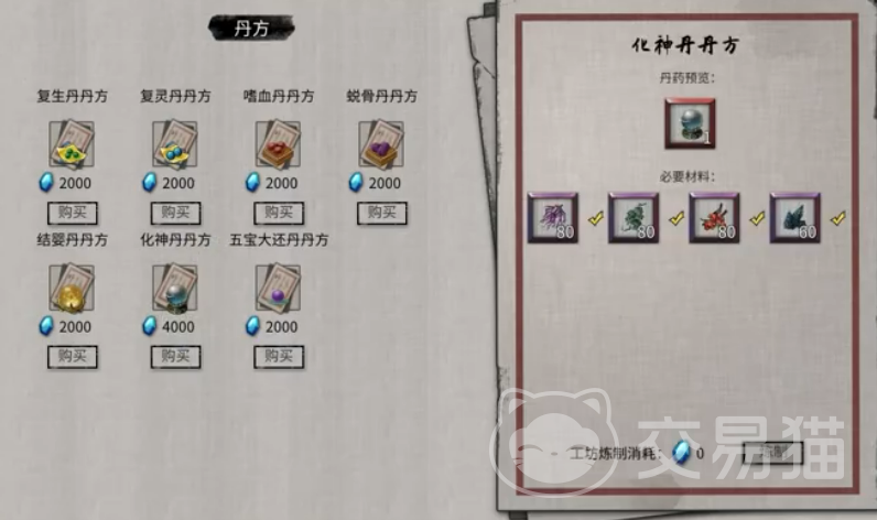 想要炼制这个丹药,肯定首先需要拿到丹方,那么丹方是能买的,直接在永吉城的工坊购买,花费4000灵石。获得丹方后,需要搞清楚这上面要哪些配料。接下来就需要对材料去收集了,需要准备两部分的资源的,其中之一是基础的材料,这些材料系统都有提示具体的采集地点。