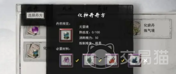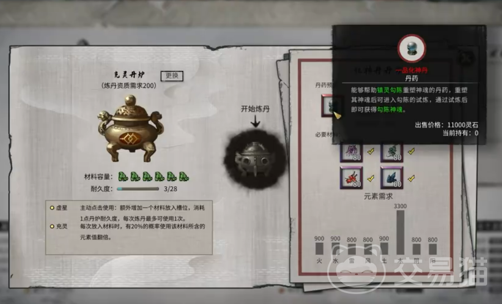 材料准备齐全后,就着手炼丹。在炼丹时,需要选择一个好的丹炉,最好直接去宗门当中,花费贡献度购买一个高级丹炉,低级的容易炸,比较浪费材料和时间的。接下来就是将准备好的材料放入其中,按照丹方的顺序依次放入,正式开始炼制。炼丹的成功率和资质相关,如果资质低,那么化神丹的炼制就会很困难,可通过击杀丹魔,获取提升资质的丹药书,增强炼丹能力。