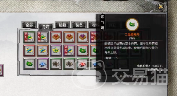 第三个增加寿命的方法就是选择食用灵果人面果,这个果实可以在奇遇当中进行触发,玩家在奇遇中寻找到该灵果后,可直接将灵果放进包袱里,如果寿命达到上限,那么就可以直接选择使用个数,每一个人面果可以增加一年的寿命上限,对于新手玩家来说,获得人面果的方法也比较简单,完成奇遇后大致能获得4~5个的人面果,玩家可以反复刷。