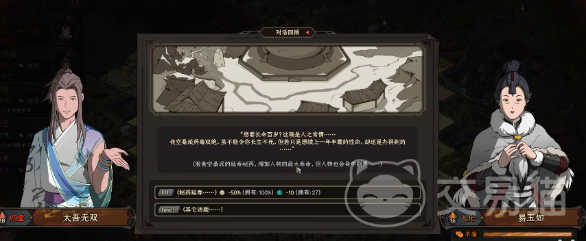 第二个方法则是找易如玉,在他那里可以获得延寿秘药,就能够增加角色的最大寿命,一般需要反复刷三到四局就可以直接实现不死之身,不过这个方法适合中后期玩家,新手玩家在刷的过程中会存在着一定的难度,因为要想获得易如玉的延寿秘药,就需要完成和boss的对决,才能够成功开启秘药的作用。
