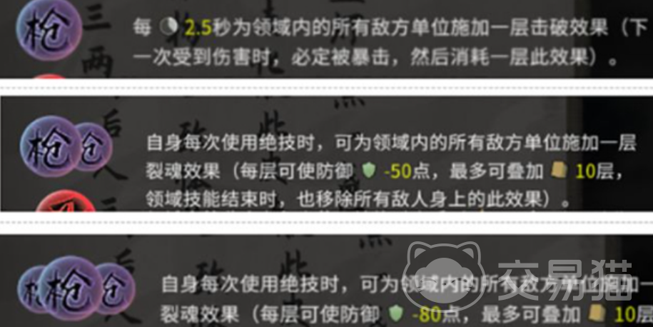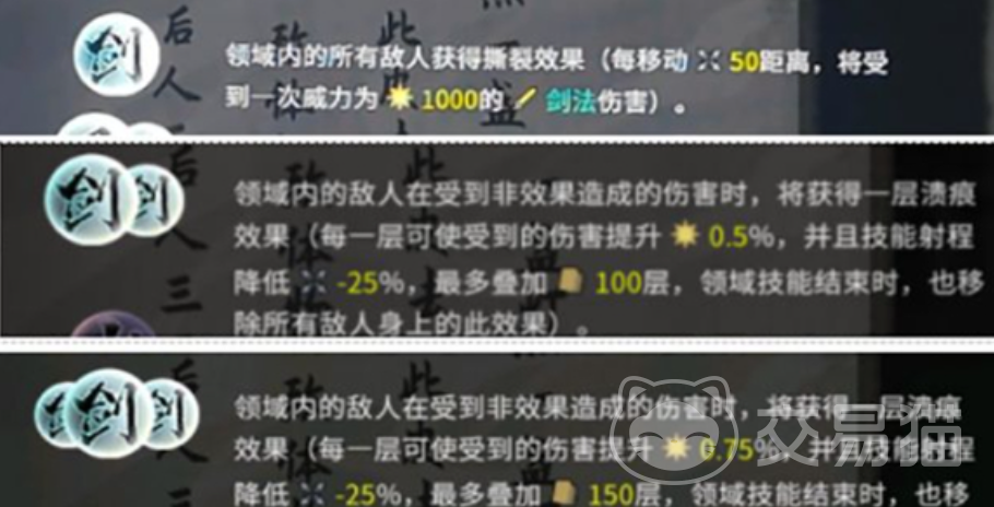 在剑领域当中,如果玩家使用了该技能,将会给敌人造成撕裂的效果。如果敌人受到了非效果而产生的伤害,这时候将会形成溃痕效果。玩家如果继续使用该技能的话,这个时候敌人的伤害将会提升,技能射程将会降低,而该领域的技能结束之后,施加在敌人身上的这个效果也就会随之消失。