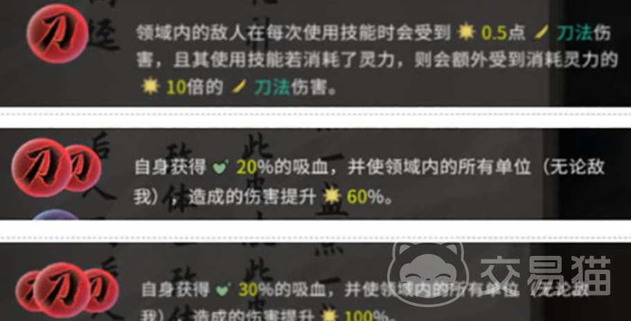 在刀领域当中,敌人在使用技能的时候,就会受到刀法的伤害。由于敌人在使用技能的时候消耗了灵力,这时候就会受到额外的刀法伤害。要是玩家自身获得20%的吸血量,敌人受到的伤害将会提升60%,如果是30%的吸血量,那么就会给敌人造成的伤害是100%。