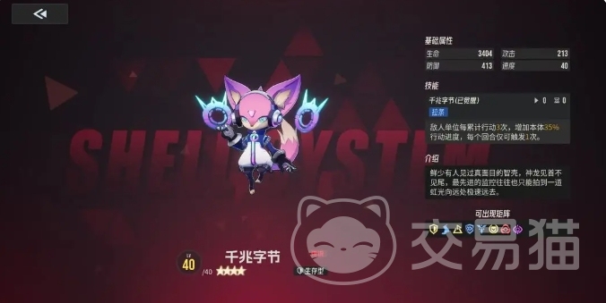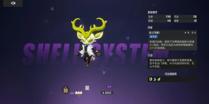 星:是一个特异品质的智壳,辅助能力在众多智壳中脱颖而出,他喜欢拾掇自己,爱对着镜子显摆,臭美的性格让它在众多智壳中独树一帜,在战斗中,星的技能更是体现了其辅助型的特质,当本体准备行动时,星能够巧妙地使其下次释放的技能冷却时间减少一回合,这一效果提升了技能的循环速度,而当本体行动完毕后,星还能为异格者带来10%的行动进度提升,随着游戏的深入和后期的发展星的能力也得到了进一步的提升,当其生命值被某种机制替换后,例如通过特定的剧情事件或者玩家的选择,它所带来的治疗效果将得到增强,提升幅度高达20%。