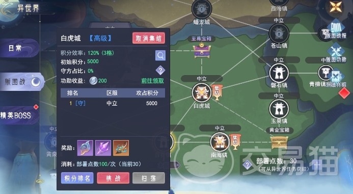 版图战在玩家达到70级时正式开启,是一项跨服的大型战略玩法。在这个玩法中,不同的城池以不同颜色标注,代表不同服务器的玩家占领。玩家可以通过攻占与本服城池实线相连的其他城池,增加本服的版图和势力。每个城池的占领不仅能为本服带来荣誉,还能在每日领取丰厚的奖励,特别是在占领与宝箱虚线相连的城池时,可以获得更多资源和道具。