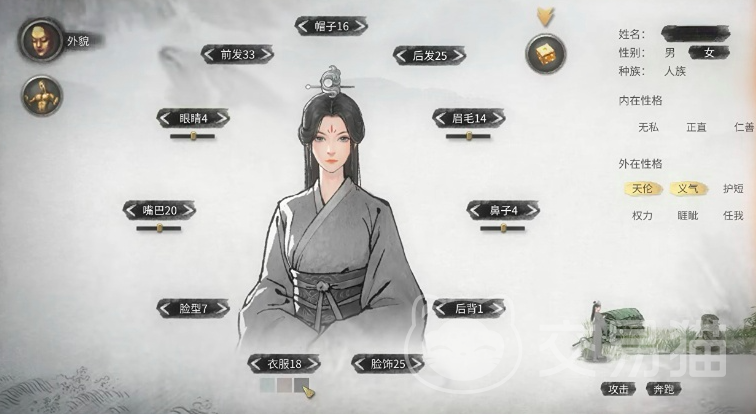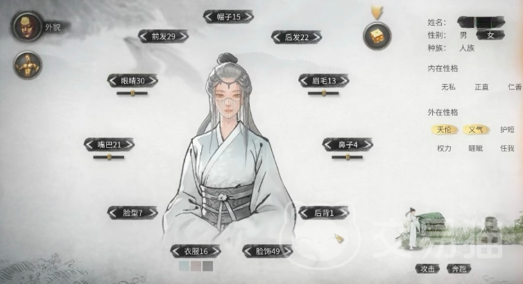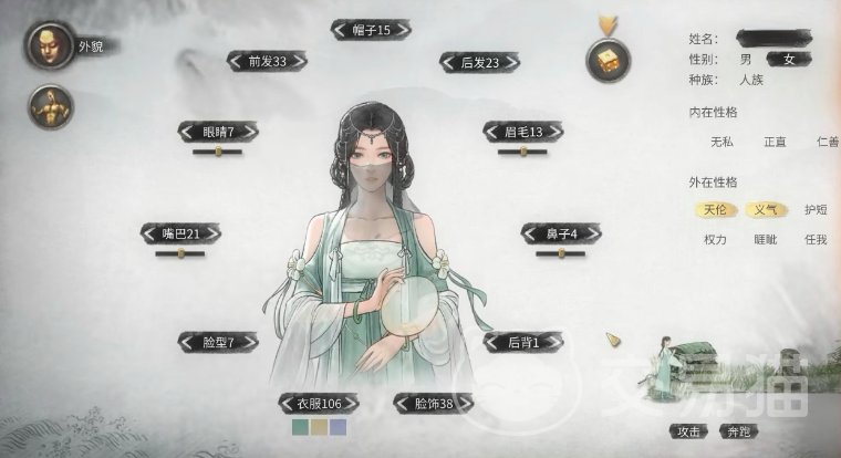 如果你想打造一个比较仙气的角色,那么建议将帽子设为15,后发设为23,眉毛设为13,鼻子设为4,后背可设为1,脸式设为38,脸型设为7,嘴巴设为21,眼睛设为7,前发设为33。在服饰上可选择106颜色的话,建议选择青色会更有仙气感,至于说外在性格的话,建议选择天伦和义气,这个角色就可以看起来仙气飘飘了。