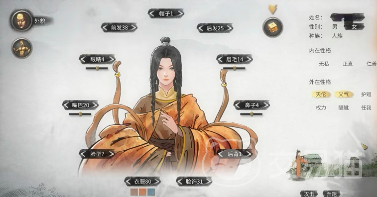 第二种是暖色系的女性角色,整体来看也是仙气感十足。在外在性格上与第一类相同,也是以仙气为主,玩家同样可以选择天伦一起帽子类型选择一前发和后发分别设为38和25,眼睛可设为四,眉毛可设为14,面部五官中嘴巴选20,鼻子选4。而这种五官搭配第七种脸型会比较好看,后背的话同第一种一样可设为一衣服,建议选择80,颜色上可以选为暖橘色脸是选择31。