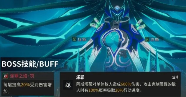 接下来是阿斯塔蒂副本,这个BOSS被玩家们戏称为当下最为朴实无华的一位,在高难度模式下,她的伤害非常高,一旦被她拖入长时间的战斗,那么基本上就无法获胜了,阿斯塔蒂的伤害可以无视防御进行攻击,她对玩家所造成的伤害十分惊人,同时每当同属性的角色行动4次后,角色所受到的伤害将会增加20%,因此,回合数越多玩家优势就越小,而且如果她的技能攻击到了克制的属性,她自身还会增加20%的行动速度,所以队伍中不能出现被克制的属性参战。