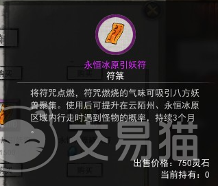 在来到这里时也可以使用冰原引妖符,主要的作用就是将其点燃符咒在燃烧之后的味道,也能够有效吸引八方的妖兽,在使用之后就可以有效提升自己在这一些区域内行走所遇到的怪物概率,大概会在持续三个月的时间内都有效果。获得的方式比较简单,玩家就可以在任意一个城镇去购买。出售的价格大概是在1500灵石,这就是一个非常重要的内容。