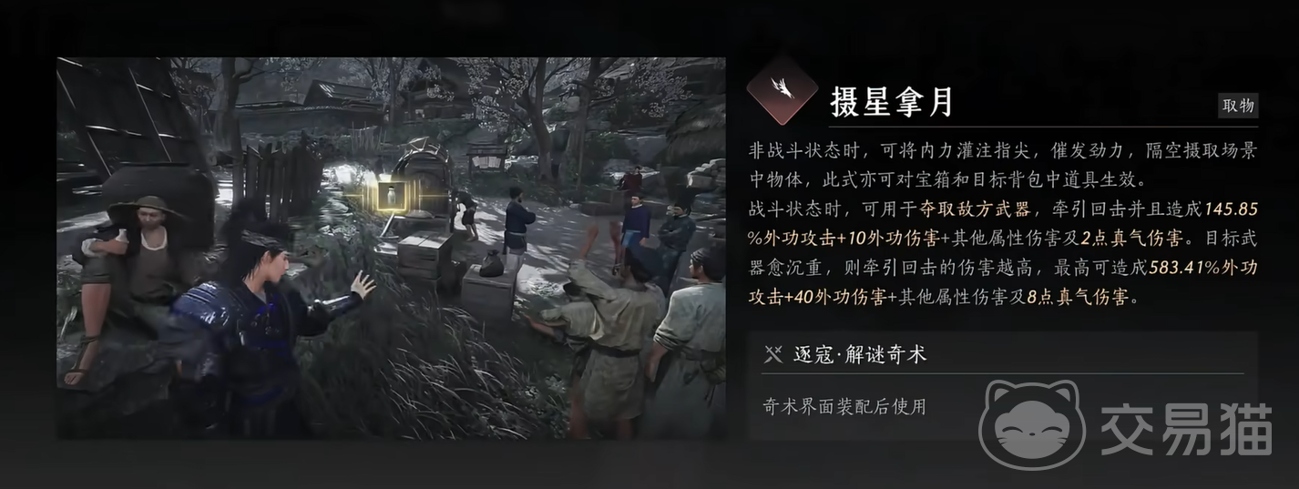 “摄星拿月”听名字就很有逼格,其实用起来也确实很猛。这门奇术能让玩家以内力操控外物,在战斗中直接卸下敌人手中的武器,顺带还可以来个华丽回击。而平时呢,它还能当作隔空取物的神手,偷包裹、取远处物件,样样都行。具体来说,这项技能的功能分为两大部分——取物和卸武。