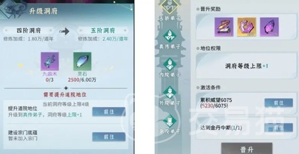 升级洞府可以提高自动吸纳灵气的速度,从而加快修炼进度,进行洞府升级需要大量九曲木,这些九曲木可以通过加入宗门并使用宗门贡献兑换。加入宗门不仅可以获得九曲木,还能参与宗门活动,获取更多资源。此外,提升道院地位也是提高洞府上限的重要途径。