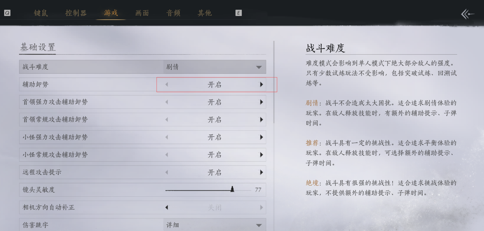 对于新手玩家或者手速不够快的朋友来说,开启“辅助卸势”功能会更稳妥一些。这个功能的特点是:在敌人发起攻击即将命中时,游戏画面会出现明显的闪光提示。同时时间会短暂变慢,给你留出一点额外的反应时间。只需要在提示出现的瞬间按下E键,就能轻松完成卸势。不过需要注意的是,辅助卸势会消耗洞识值,如果洞识值不足,这个功能将无法使用。所以想要依赖辅助功能的玩家,要学会合理规划洞识值的使用。