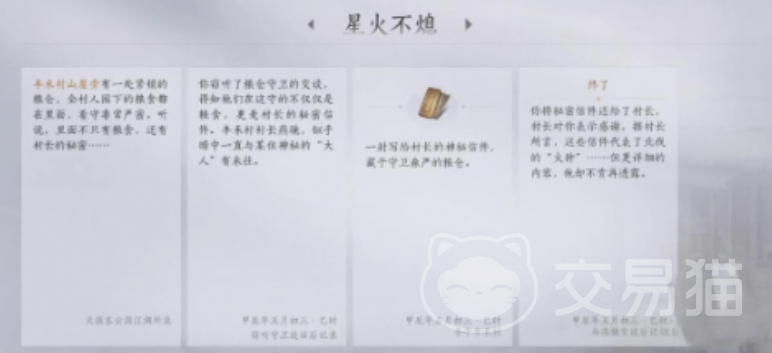 燕云十六声星火不息攻略已经介绍完毕,其实玩家主要就是获得宝箱,拿到秘密的信件以后,将秘密的信件直接交给npc,这时候就代表任务已经完成,当玩家或完成任务之后就能够拥有奖励。