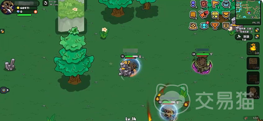 接下来看元素,树木、石头、铁矿这些事比较基本的元素,这些基础材料都是能利用镐子挖的,主要的作用就是用来建造各种不同的建筑物,不同的建筑物拥有不同的效果,例如可回血,提高伤害,增加位移,限制敌人等。地图本身的一些东西也是附带buff的,需要知道的是,井水能恢复50%的血量,对祭坛连续攻击有随机的效果,可能是加血,可能是移速提升,也可能是提高采集的效率;地图里面也有功能性的建筑,墓碑就是一个,和它互动,能隐形。
