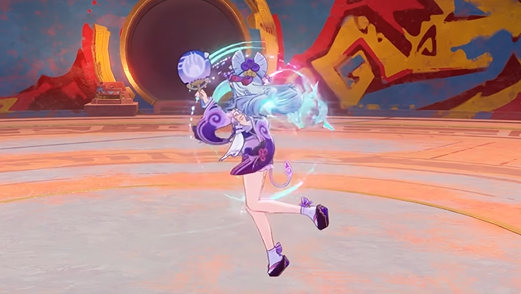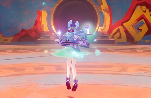 接下来是她的技能解析。梦见月瑞希的元素战技“可以让她进入“梦浮状态”,悬浮于地面并对范围内的敌人造成风元素伤害。在梦浮状态下,她会持续对敌人造成范围风伤,同时基于元素精通,增强附近队友的扩散反应伤害。这种状态既能提供输出,又能提升队友的伤害能力,适配性极高。