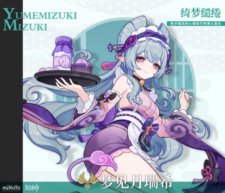 从背景设定来看,梦见月瑞希的灵感来源于稻妻传说中的“食梦貘”,这种妖怪以吞噬噩梦为生,传递宁静与安稳。而月瑞希则将这一能力化作职业,成为稻妻闻名的心理诊疗师,同时在一家名为“秋沙钱汤”的温泉馆兼职。尽管她看起来总是平易近人,但她的笑容背后似乎隐藏着一丝疲惫,仿佛为他人分忧太多而累积了未曾言说的痛苦。可以说,梦见月瑞希的设计是文化韵味与人性化设定的结合,深得原神玩家喜爱。