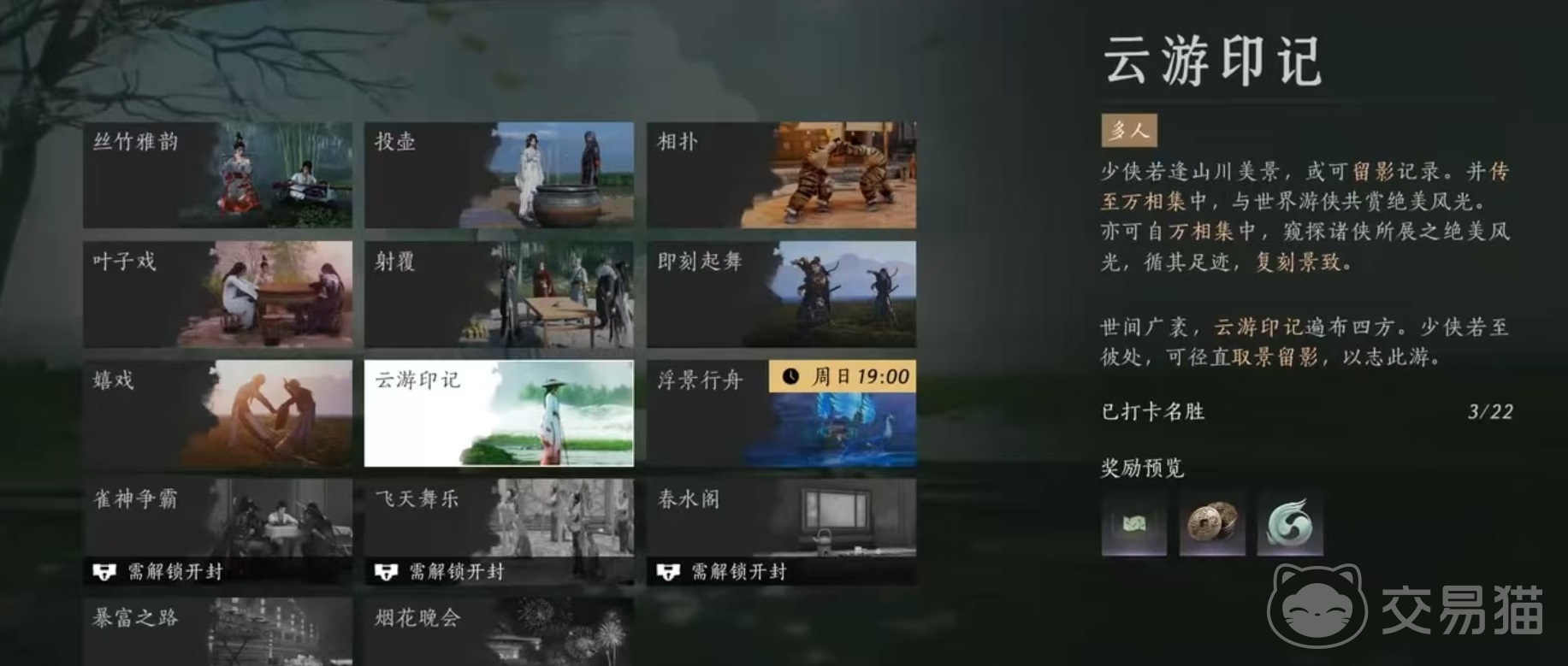 首先大家打开游戏的主页面,在页面中找到同游功能,同游是指玩家可以和其他侠客一起游玩,积攒每周奖励,也是社交活动中一项比较重要的设定。在同游中有多项内容,包括侠境,试剑、闯荡、止戈和闲趣等一系列选项,找到其中的闲趣,就可以看到诸多的闲趣活动。大家比较熟悉的丝竹雅韵、投壶等都在这里,拉到下方就可以在中间偏下的位置看到云游印记这项活动。
