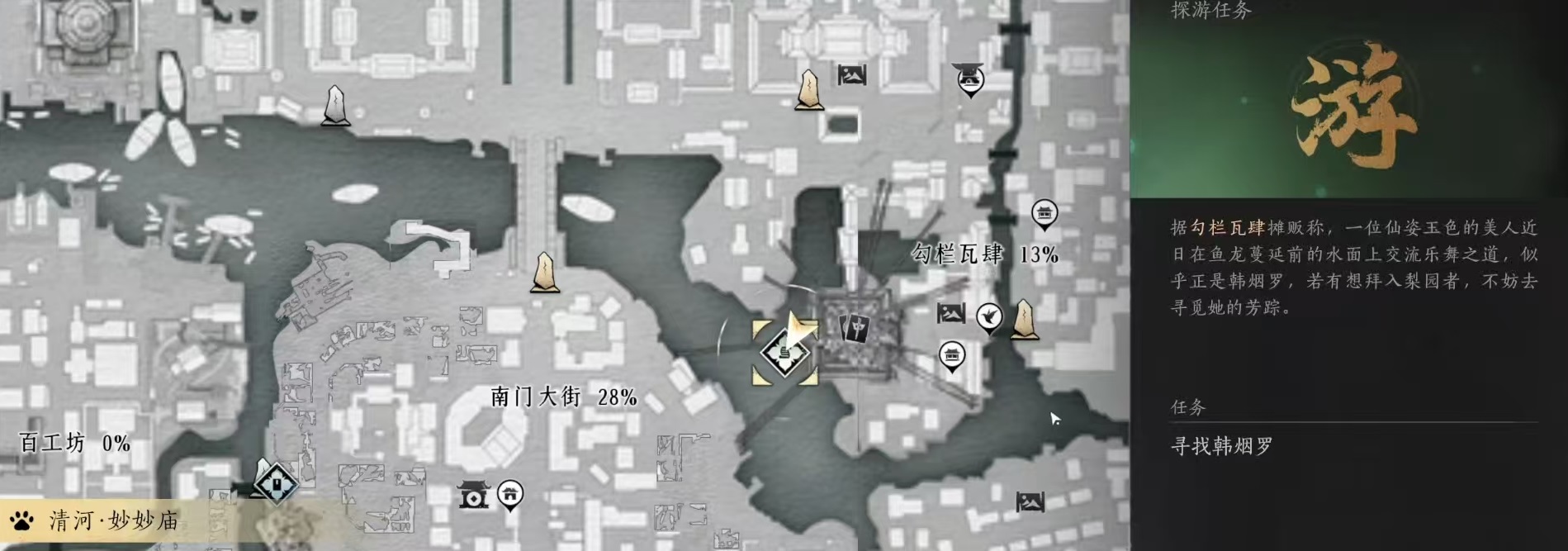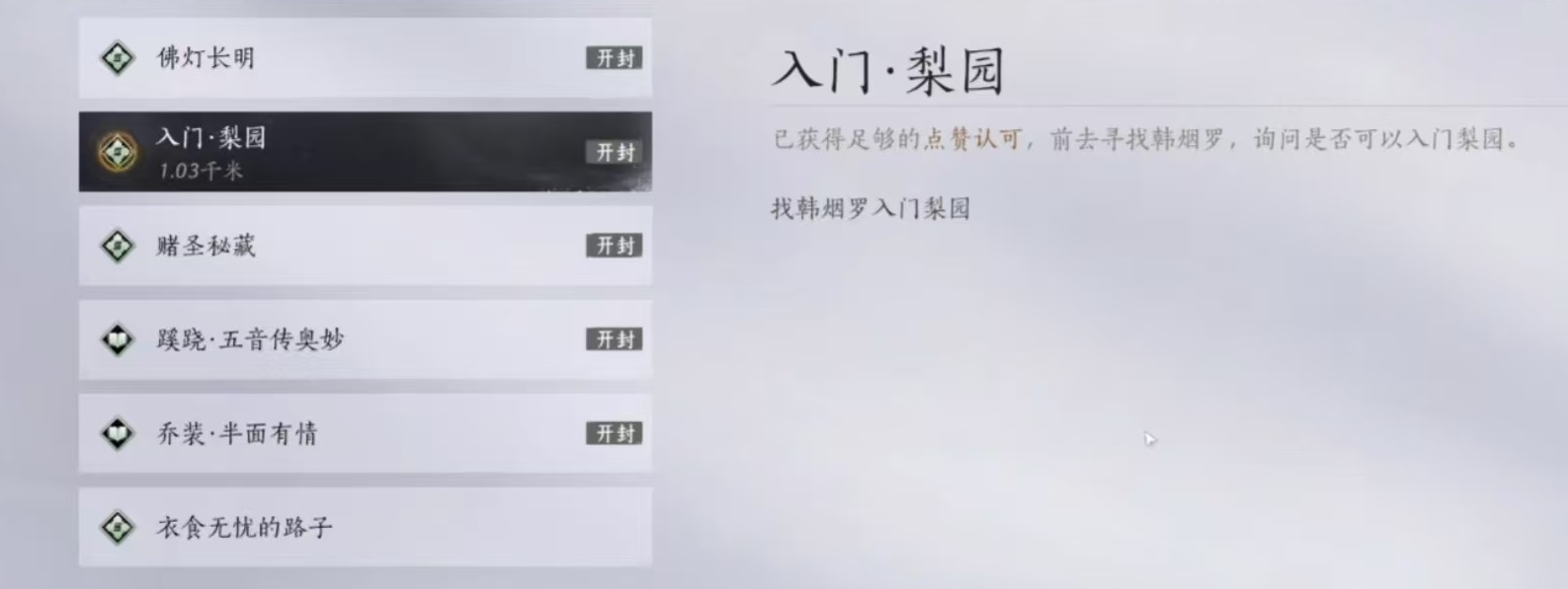 如果想要加入梨园,有一个非常稳定的入门方式,来到开封,在开封地图中找到勾栏瓦肆,勾栏瓦肆旁边的河边上会看到一个npc,这个npc是坐在船上,也就是韩烟罗,对话之后,解锁梨园的入门任务。该任务需要玩家去表演才艺,然后获得实十个玩家点赞,就可以结束整个任务。表演的才艺种类则不会受到限制,大家可以去开封右上角春水阁2楼,这里会有很多人在这里泡澡,在这里选择不同的舞蹈动作,无论是弹琴还是跳舞都是可以的。