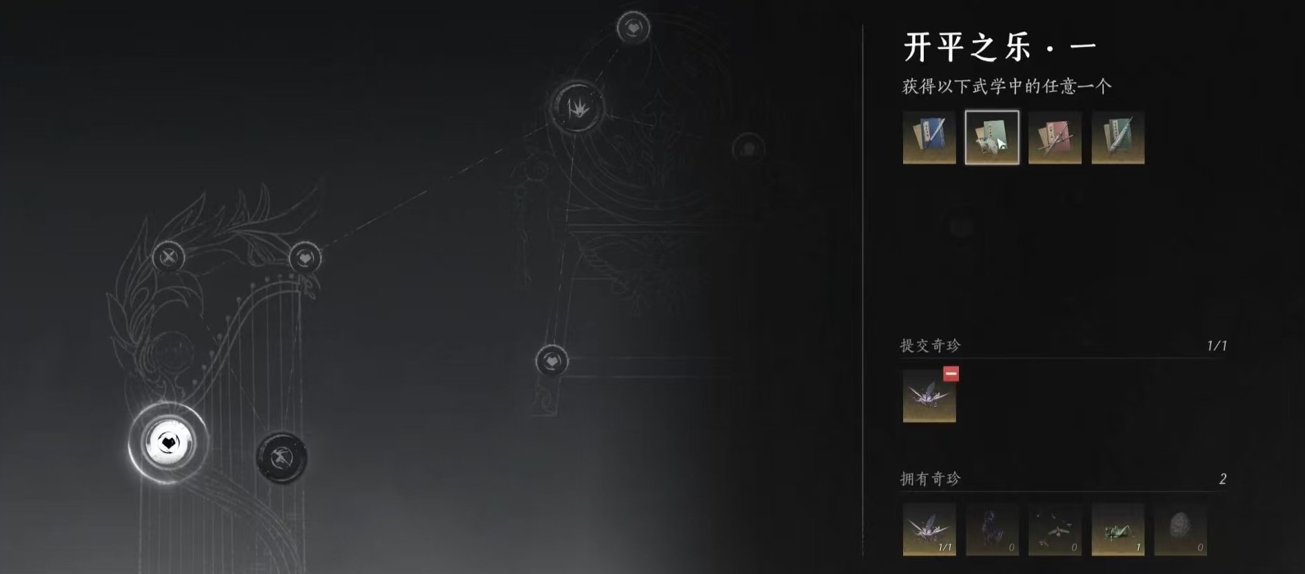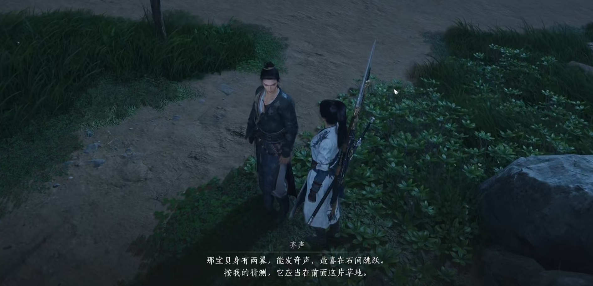 开启追踪之后,可以看到不远处有任务所需要的道具,把任务需要的道具也就是一个虫子捡起来后,这时再回来交任务,就看到齐声已经在凉亭中间了。和他对话交任务后就可以开启npc功能,它有一个主要的功能就是提交奇珍,然后在4个武学中任选一个。这四个武学分别是扇子的武学明川药典、伞武学落英惊鸿伞、双刀武学泥犁三垢等。按照自己的喜好以及实地的需要去进行选择。后续齐声也是可以提供很多帮助,大家在大世界探索中获得奇珍,并且通过五音启太平系统,就可以继续回来和齐声进行交互。