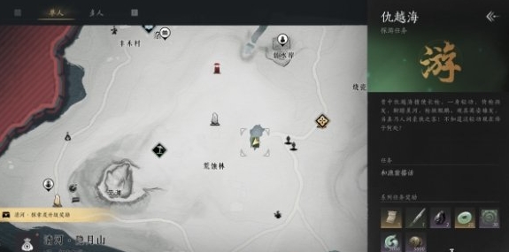 玩家首先前往隐月山区完成仇恨海任务,找到一位名为渔翁的NPC,玩家与渔翁对话后,便可接取卷五·仇越海任务。