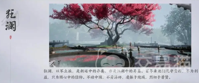 狂澜:是一个擅长水元素,而且门规严谨的门派,主要是以长枪作为武器门派,也要求每一周饮酒的次数不应该低于10次,并且保证不能喝醉。