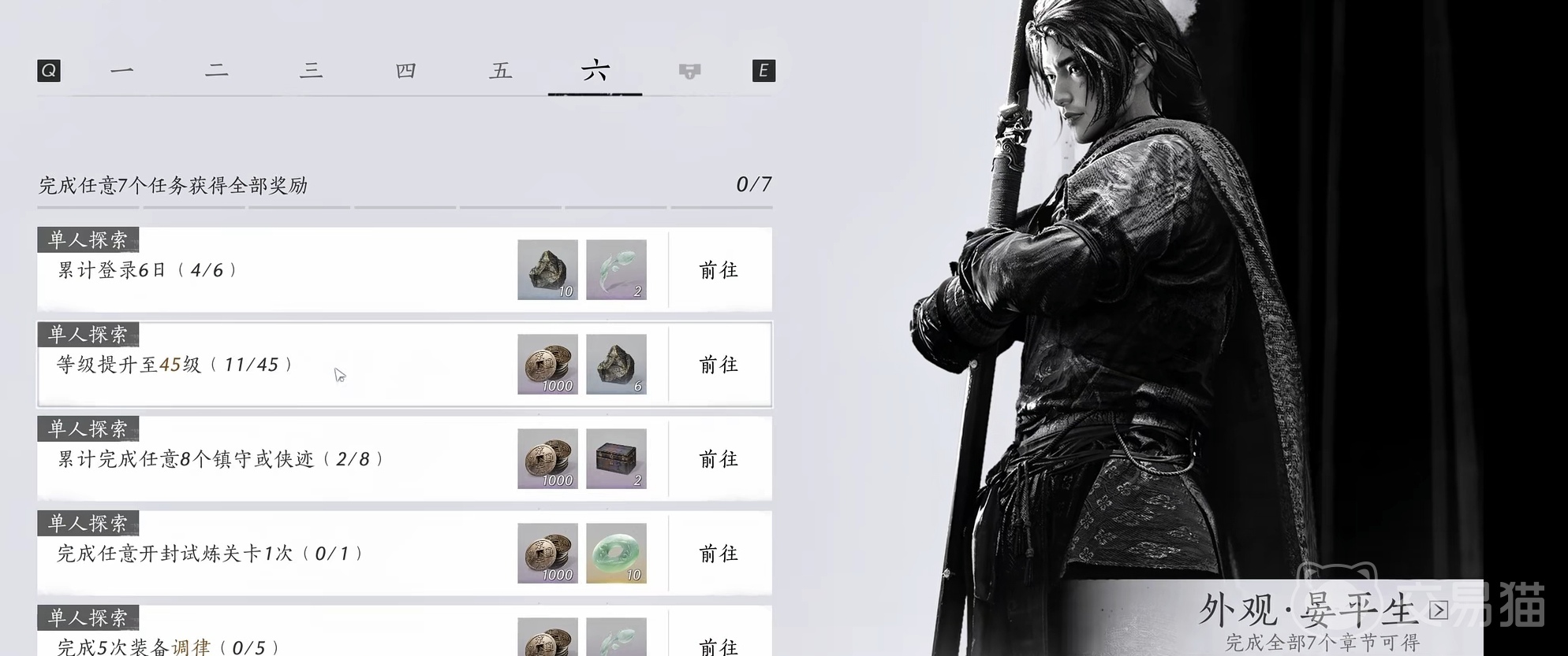 第一套介绍的是:晏平生,这套服装只要完成侠客行中的七声江晏的任意七个任务,再加上签到七天就能拿到这一服装。