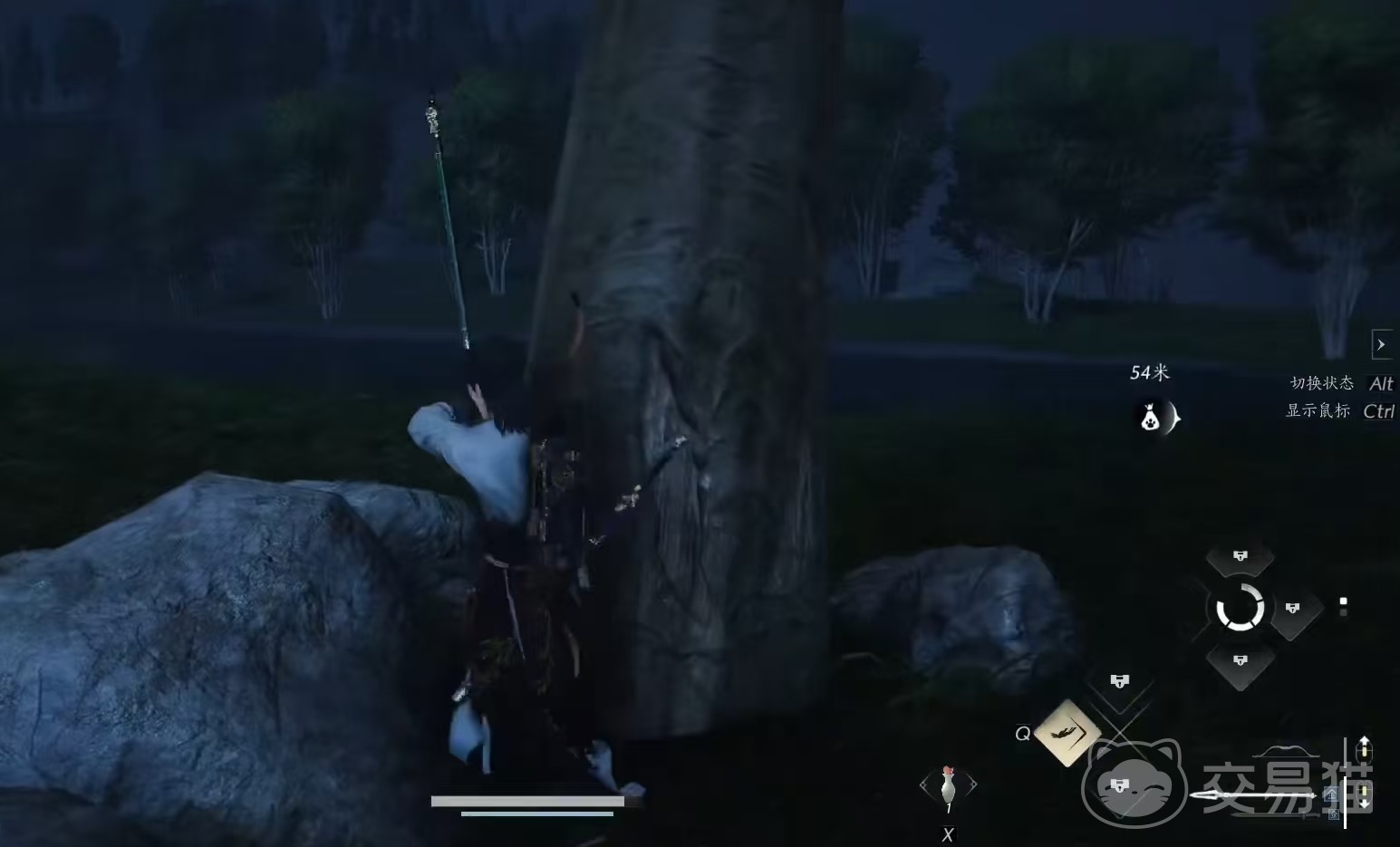 首先传送到北竹林,找到蓉蓉并与她对话,对话之后可以获得关键信息,只要能找到三个木牌就能够拿到一本武林秘籍,接下来就是去寻找这三块木牌。首先是往回走,前面可以看到有一棵最大的树,将这棵树砍倒之后,就可以获得第1个木牌。砍树不需要额外工具,拿着自己的武器对着树进行攻击就可以了,攻击一会之后整棵树就会砍倒,砍倒之后拿到第1块木牌。砍完树之后,从左边这个悬崖一直往上爬,爬上之后往右走,同样是沿着悬崖一直往上爬,爬到最高点。