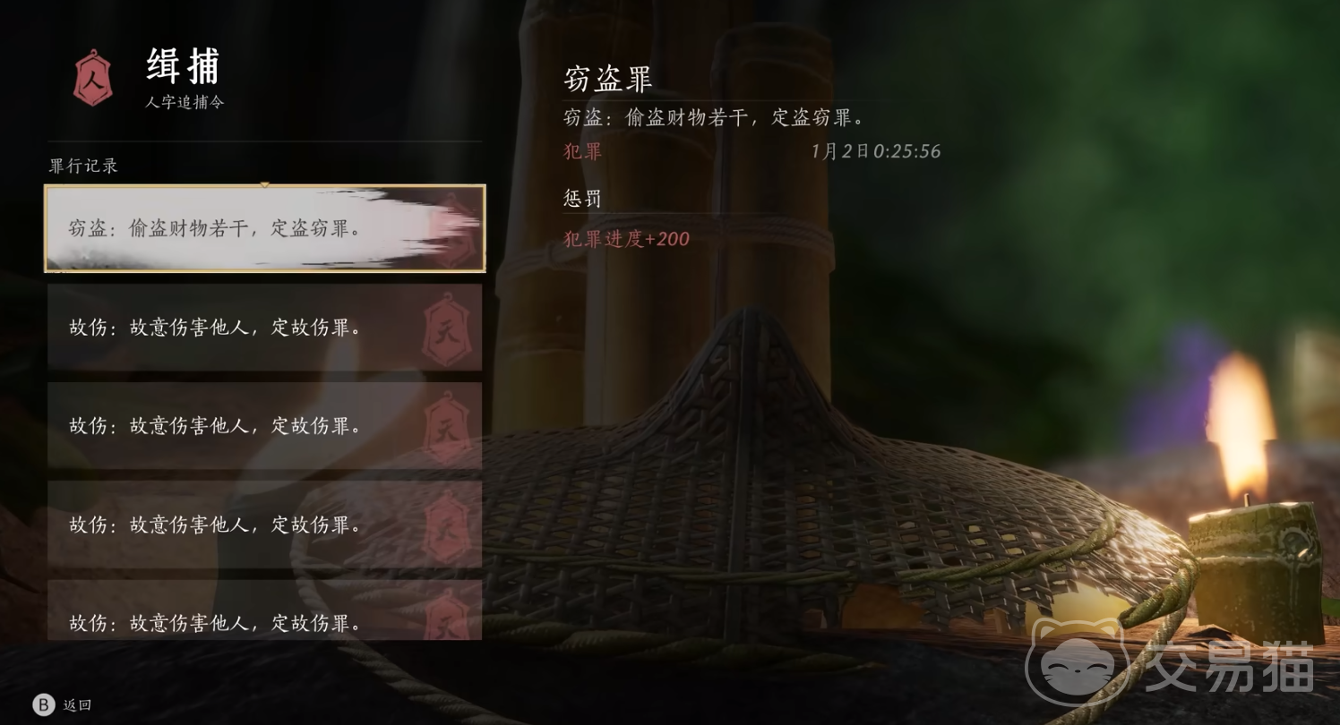 如果各位玩家不知道什么条件触发犯罪,可以前往个人的角色页面,然后点击缉捕页面,就会有列出当前角色犯下的罪以及犯罪进度值,如图所示。这时候玩家的角色条会变成红名,然后有前来追捕的捕快,战斗失败就直接进牢狱。