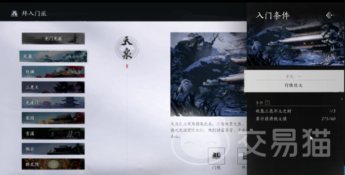 这时就能选加入该门派了,但是需要60侠义值,外加3个不义之财,目前已经获得了1个,接下来就需要去寻找另外两个,找到之后,就能看到天泉门派的门规了,门派还会发布任务与挑战,完成后能提高自己在门派中的地位以及声望。