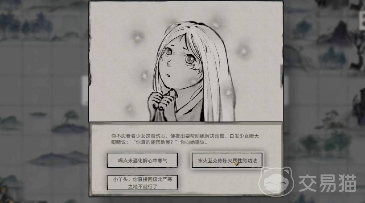 在这个奇遇任务当中,玩家总共有三个选项,第一个选项是为小女孩购买米酒,帮助小女孩驱除寒气,米酒在附近的城镇内,随意找到一个客栈或者是酒馆,就能够花费一千颗灵石购买了,在交付了米酒之后,玩家就可以获得五灵根数值的加成。