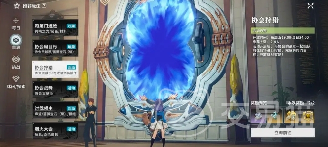协会狩猎:是一项每周五晚上19:00至周日晚上24:00开放的活动,推荐2-4人组队参与,活动开启后,与协会的战友们一起前往猎场进行狩猎,共同完成目标,获取挑战奖励,这是一个考验团队协作和实力的活动,且需要大家加入协会之后才可以参与,组队的成员基本都是同协会的成员。