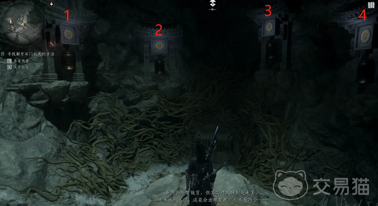 先踩住旁边的花,再打开机关否则会提示顺序是错的,具体的顺序按照下图的3、4、1、2用弓箭射击就能打开石门,进门后会发现月神黎蓁蓁已经去世,拾取桌上放眼睛的寒玉匣,下楼梯后先拾取桌上的童子小剑和后方地上的拜月花,再到另一处平台将3张破碎信纸合并得到完整书信,最后回到月神处将这些提交,任务就算完成并获得红尘障目。