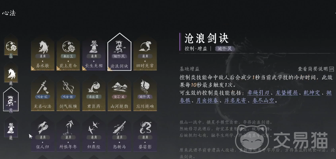 1、武学心法:武学使用的是九重春色和明川药典,心法则是花上月令、易水歌、沧浪剑诀、长生五相。