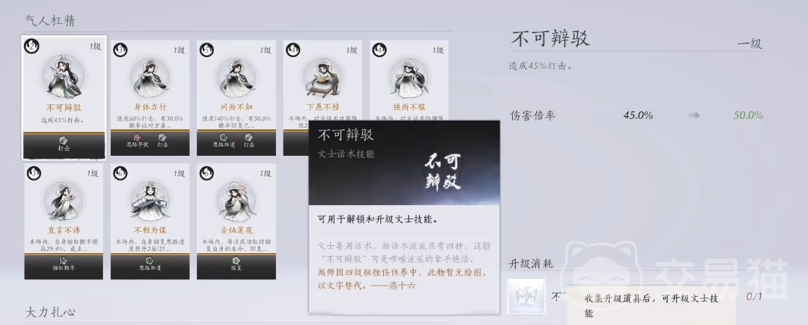 点开文士板块能看到文士主要靠话术来来提升等级,一共分为入门、精通、巧舌、雅士、大儒几个等级,想要提升话术的话需要完成给类话术小游戏来获得营生手册。